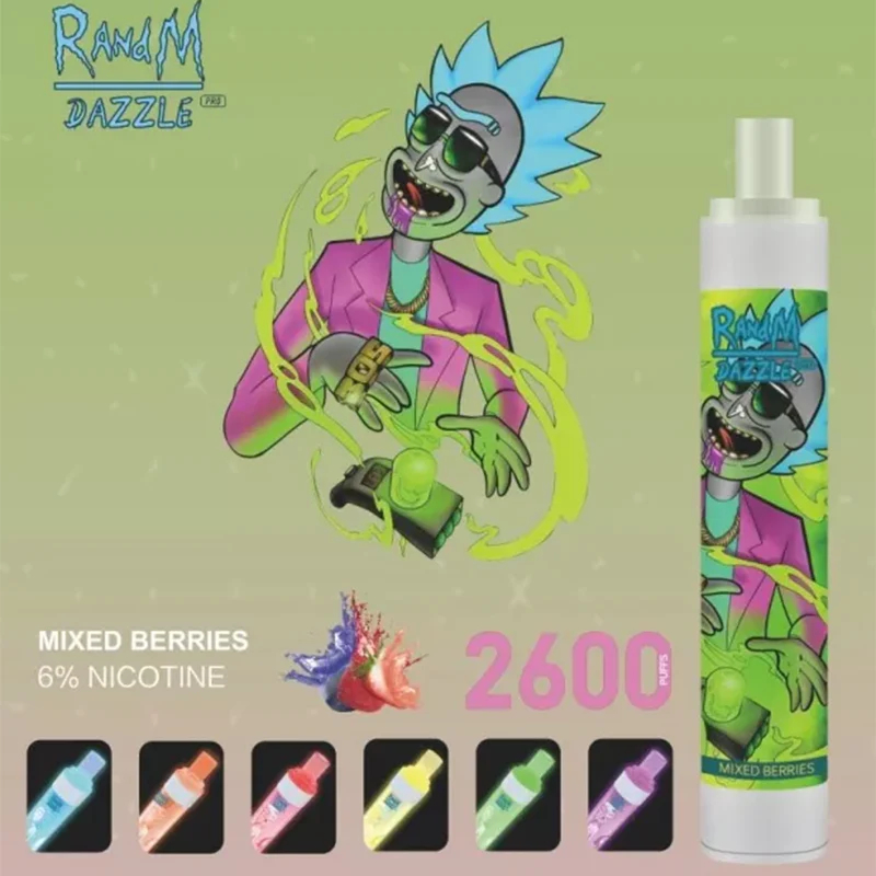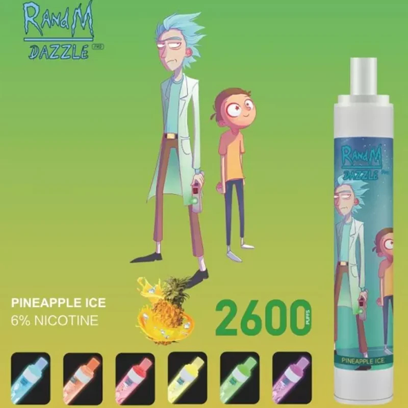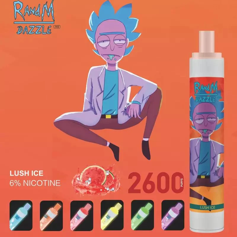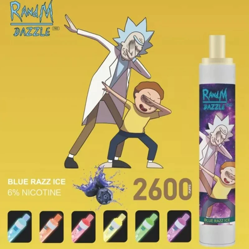 RandM Dazzle Pro is a rechargeable disposable vape with popular Rick and Morty and colorful LED light designs. It contains 6ml of 0/2/3/5% nicotine salt e-juice and offers up to 2600 puffs.